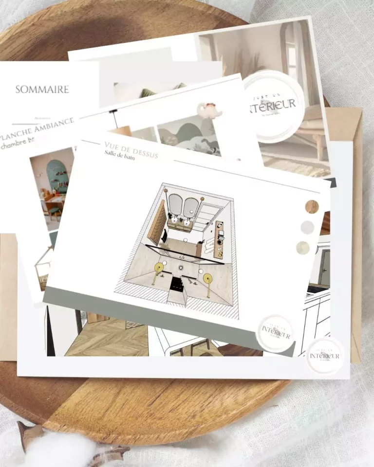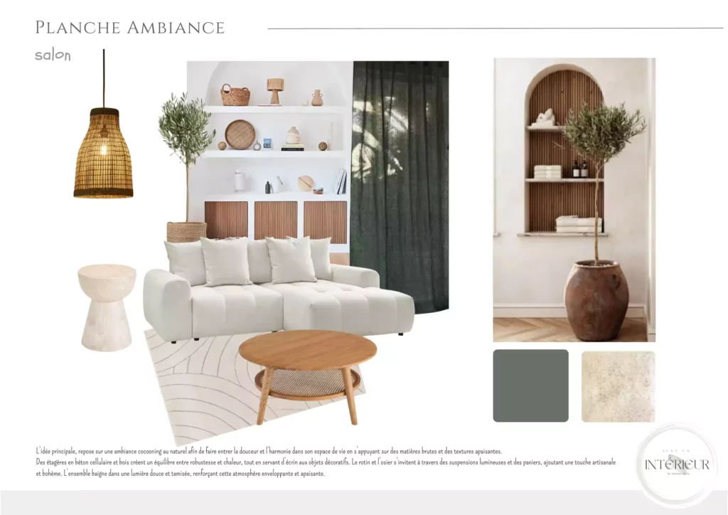 - la planche ambiance, avec les couleurs, matières et photos d’inspiration qui vous aideront a réaliser votre projet déco.