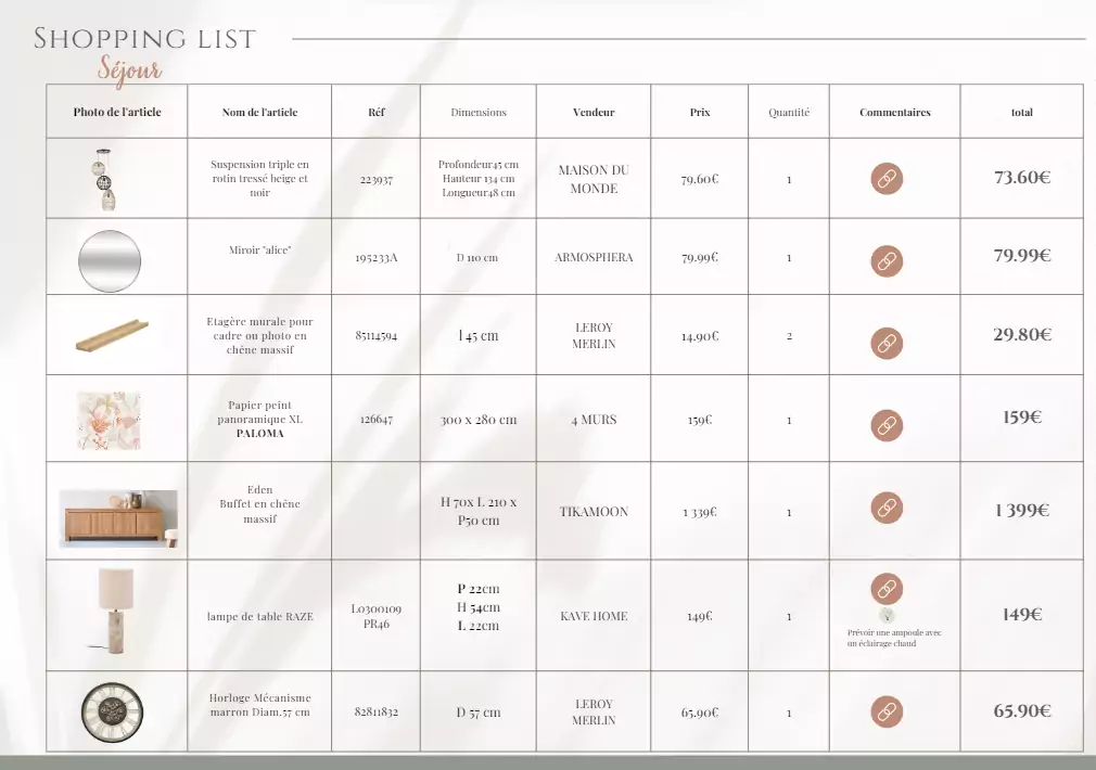 La shopping list vous fournit les références nécessaires pour aménager et décorer votre intérieur selon le budget prévu. Ce document vous indique les références produits, les fournisseurs, les dimensions et vous permet de réaliser votre shopping déco en toute sérénité.
